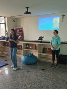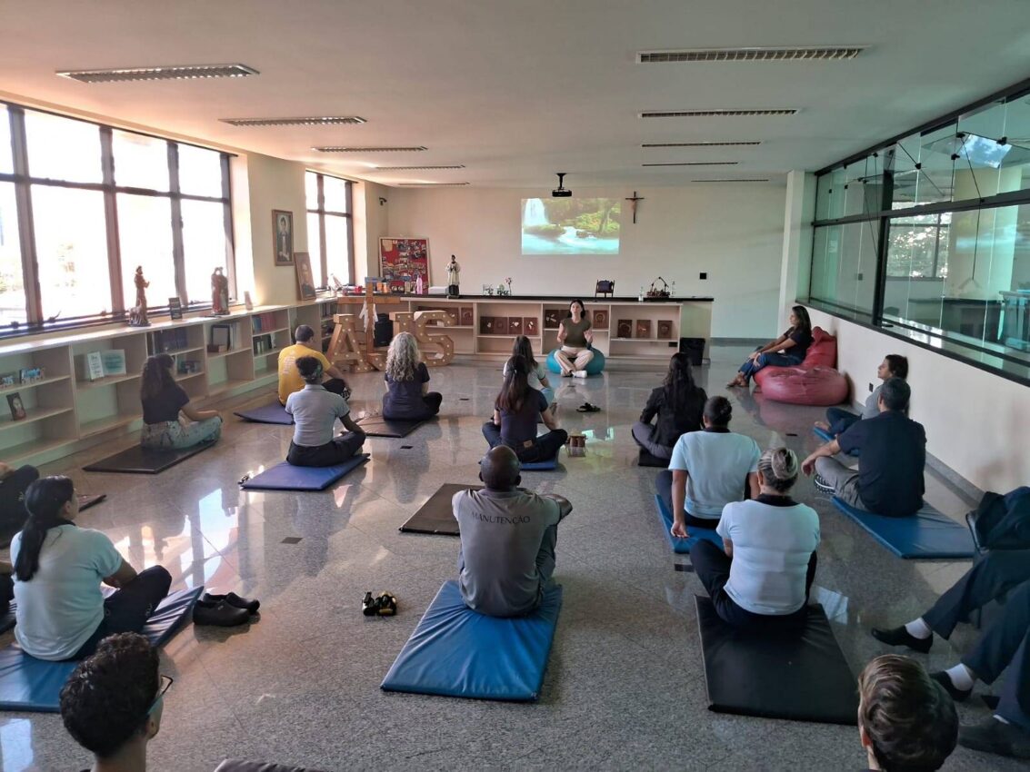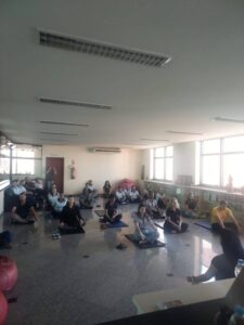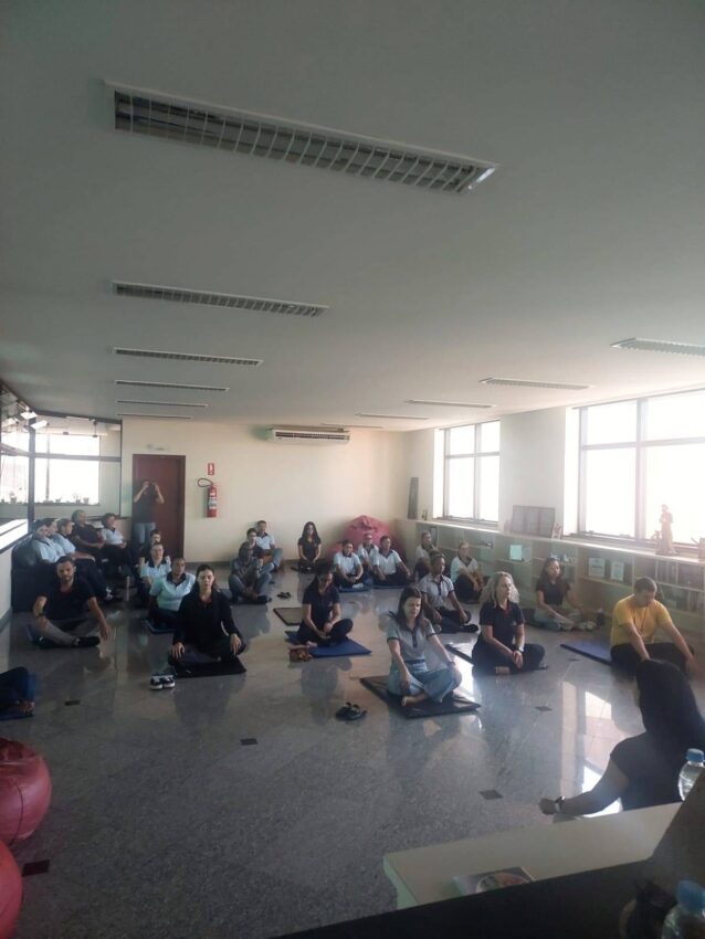 Durante o encontro, foram trabalhadas técnicas de respiração e relaxamento, proporcionando mais consciência corporal, redução do estresse e bem-estar.